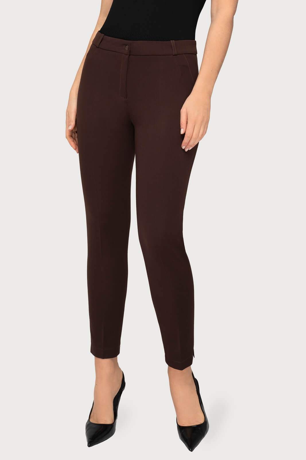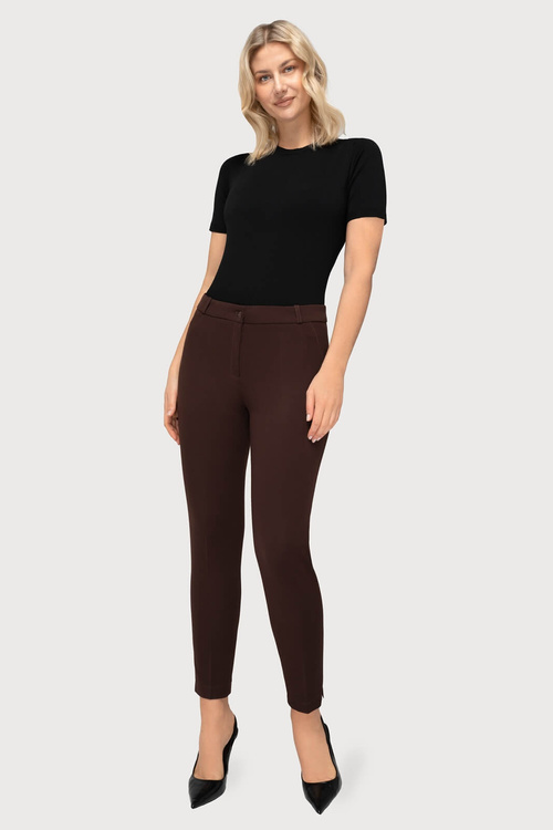 Brązowe spodnie cygaretki w klasycznym fasonie 7/8 to idealna baza do stylizacji zarówno codziennych, jak i bardziej eleganckich. Wysoki stan i zwężane nogawki modelują sylwetkę i optycznie ją wydłużają. Dodatkowym atutem są rozcięcia na dole nogawek.