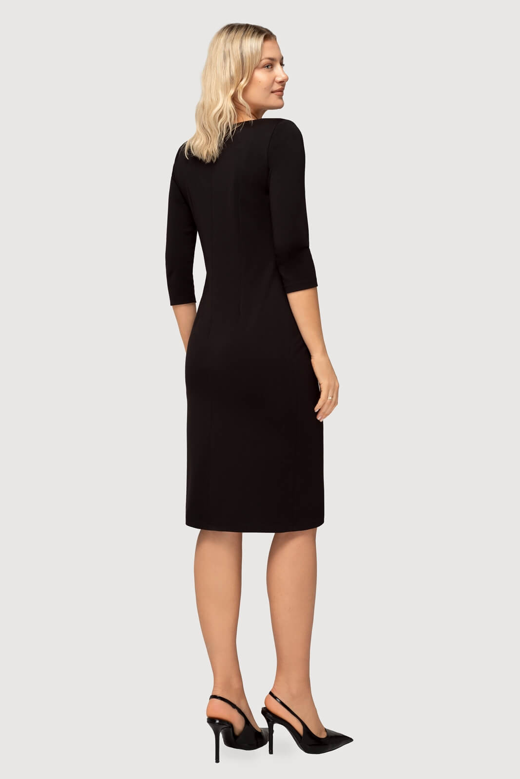 Elegancka sukienka Vanessa czarna z węzłem i marszczeniamiuszyta z dzianiny.